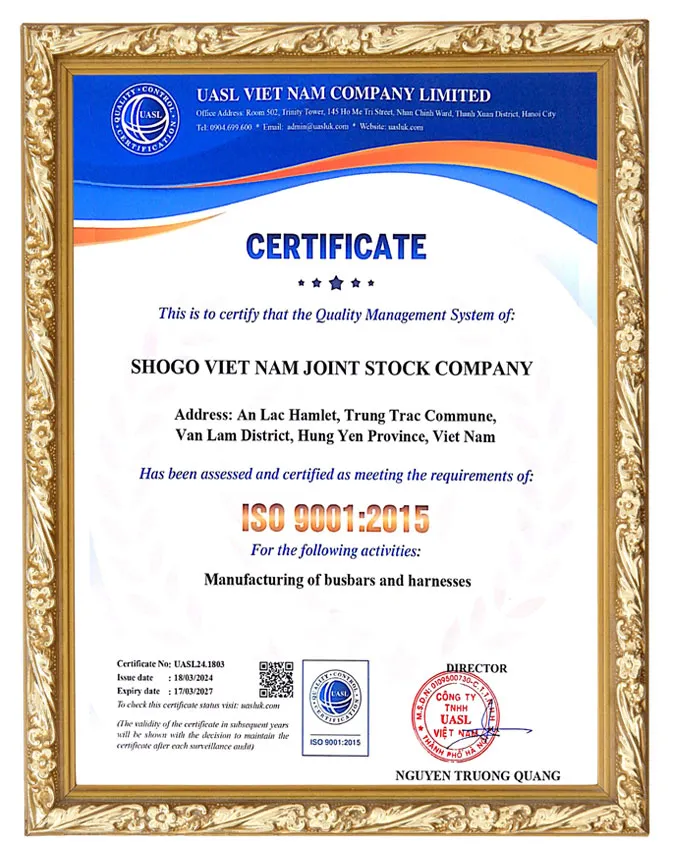 Với nhiều năm kinh nghiệm trong ngành công nghiệp phụ trợ, chúng tôi đã đạt được các chứng nhận như: ISO 9001:2015, IATF 16949:22016, ISO 14001:2015, ISO 17025:2017,....Đây là minh chứng rõ ràng cho cam kết của chúng tôi về việc cung cấp sản phẩm chất lượng cao, đáp ứng tiêu chuẩn quốc tế.